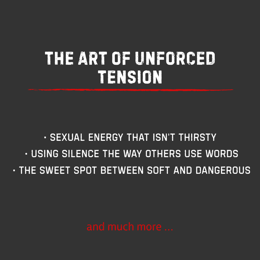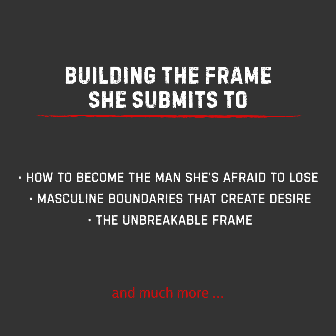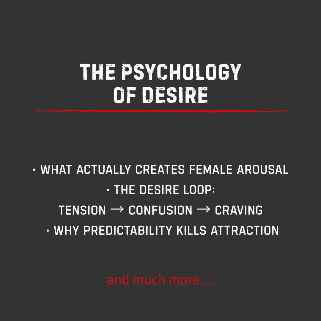 Part by part, you'll rebuild everything: The shift from begging to commanding. The psychology of arousal and unconscious feminine response. How to build a frame she submits to without saying a word. The art of unforced tension—silence, eye contact, push-pull that isn't a game. The escalation system that turns neutral moments sexual. How to control the narrative so she chases validation instead of you chasing her. And finally, how to lock in consistent desire and become the man she's terrified to lose.